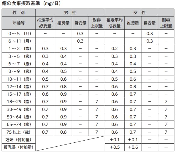 ただ、銅サプリメントの使用が死亡率を上昇させるという研究が存在することもあって、アメリカ・カナダの食事摂取基準をもとに耐用上限量が設定されています。