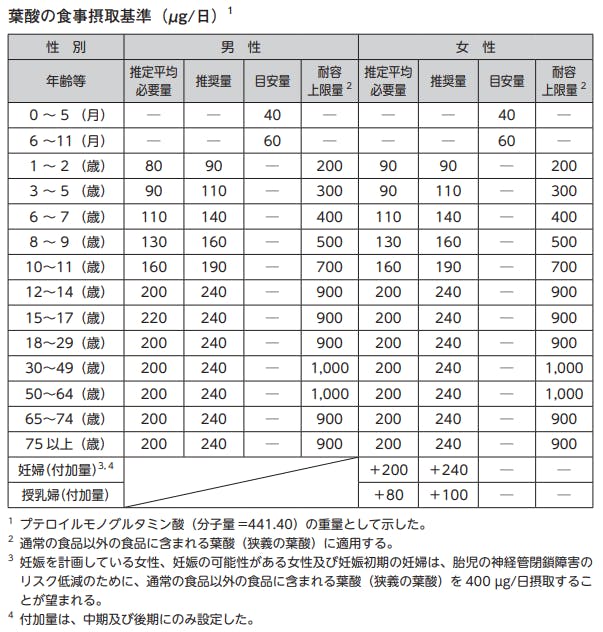 赤ちゃんの先天異常を防ぐため、妊活段階から妊娠初期にかけて特に葉酸は必要で、予防のためにサプリからの摂取する葉酸として400μg/日が推奨されています。