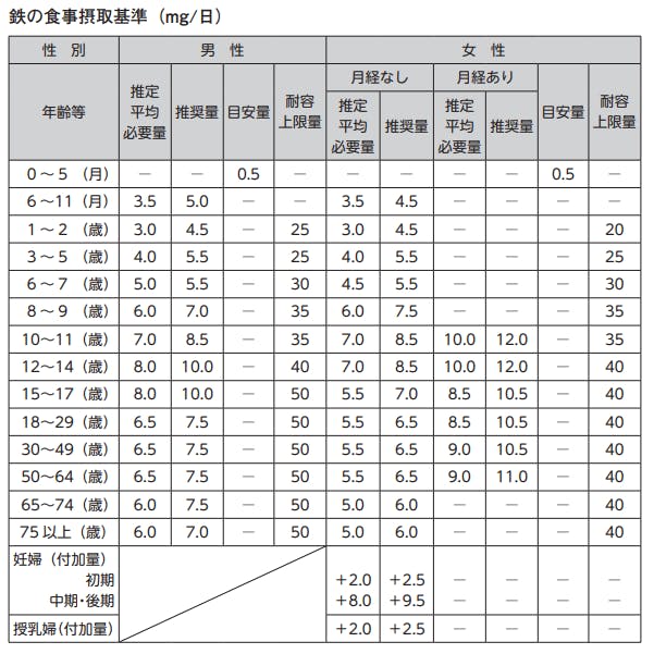 月経によって鉄が体外に流れ出てしまうため、月経のある世代の女性は推奨量が増加します。