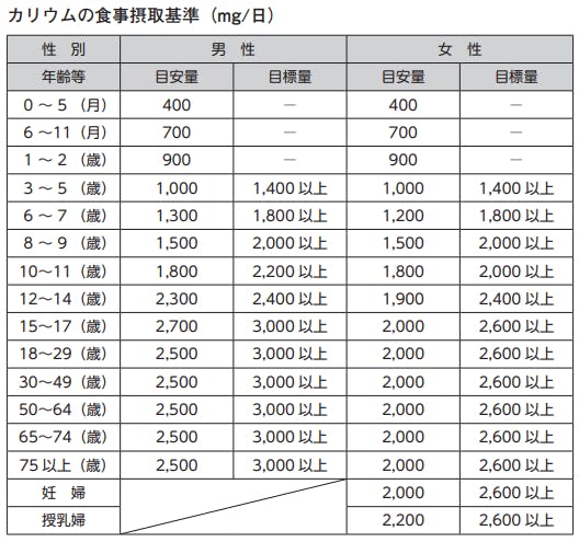 高血圧を中心とした生活習慣病の発症・重症化予防を目的に目標量が設定されています。成人の男女で、2,600~3,000mg/日以上が目標量として設定されています。