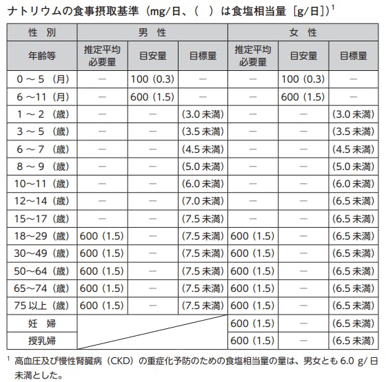 成人の男女で6.5~7.5g/日未満が目標量として設定されています。