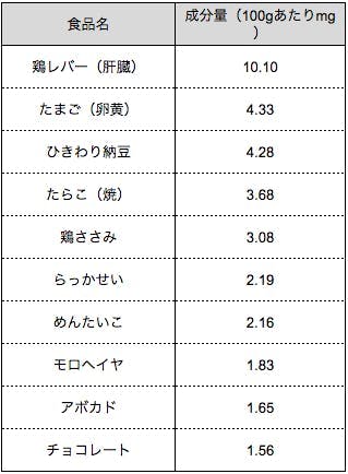 レバー、たまご、納豆、チョコレートなどに多く含まれています。