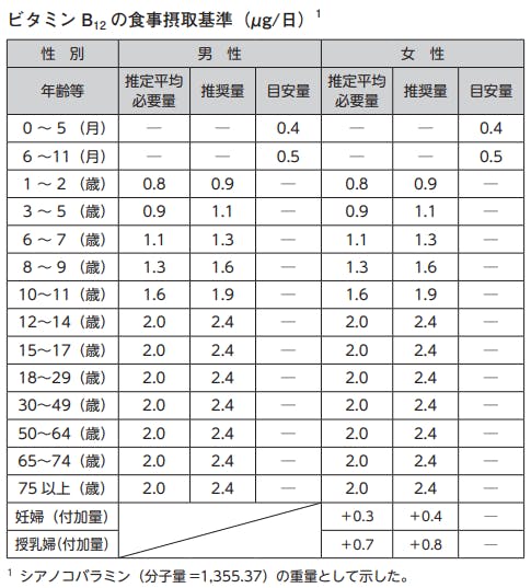 不足のリスクは少ないが悪性貧血、神経障害、動脈硬化などの欠乏症がある