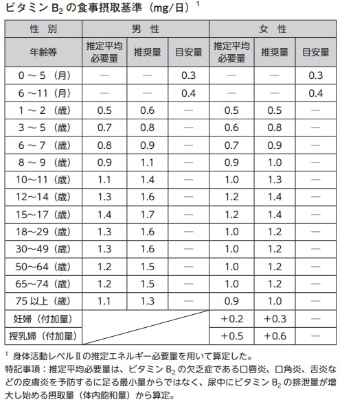成人の男女で1.1~1.6mg/日摂取が目安とされています。過剰摂取による健康障害の報告がないため、上限量の設定はありません。強い運動をする人、ストレスの多い人は必要量が上昇します。